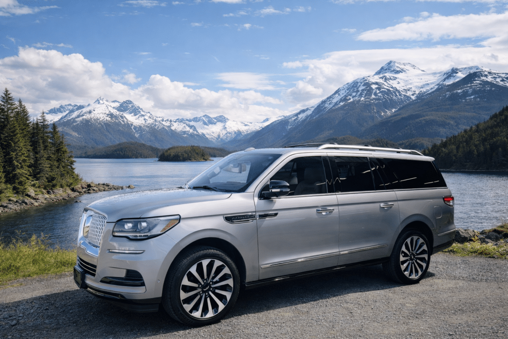 Alaska Bound Charters’ new 2024 Lincoln Navigator along the Wrangell Narrows — ready to welcome guests arriving in Petersburg, Alaska.