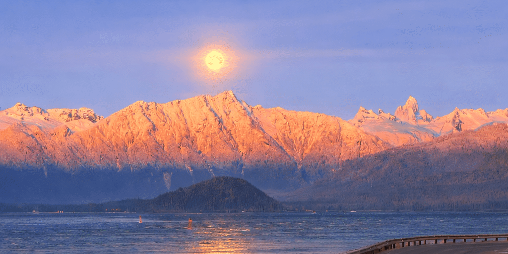 Greetings from Little Norway! It’s been an unusually cold and snowy winter here in Petersburg, Alaska. We haven’t had this much snow in years! But as the light returns and the days lengthen, our snow-capped peak, Devil’s Thumb in the Coastal Mountain Range, reveals its full magnificence, especially at twilight with the alpenglow illuminating the jagged peaks.