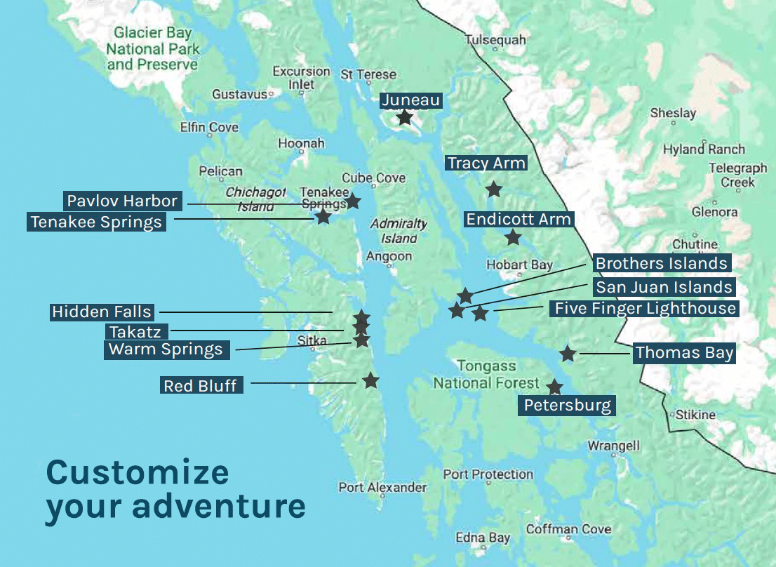 Fully customized to suit your type of adventure. Cruise with us and we will show you the best natural spots for wildlife viewing and local experiences. Here’s just a selection of journey highlights to explore from Petersburg to Juneau in Southeast Alaska.